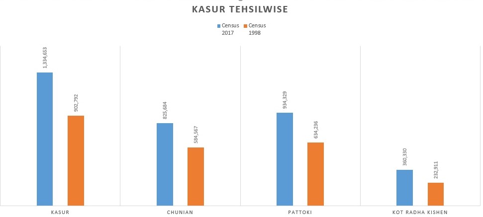 The population of District Kasur district (tehsil-wise) on the basis of census conducted in 1998 and 2017 respectively is: